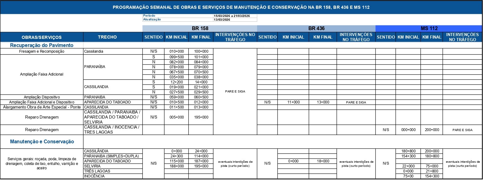 Semanalmente, você vai poder acompanhar em nosso site a programação das obras e serviços de conservação e manutenção que a Way-112 realizará na MS-112, e em trechos da BR-158 e BR-436. Lembramos que esse trabalho interfere no tráfego, causa transtorno e exige paciência e muita atenção dos motoristas, mas no final compensará plenamente pelo maior conforto e segurança que proporcionará a todos os usuários. Contamos com sua compreensão
